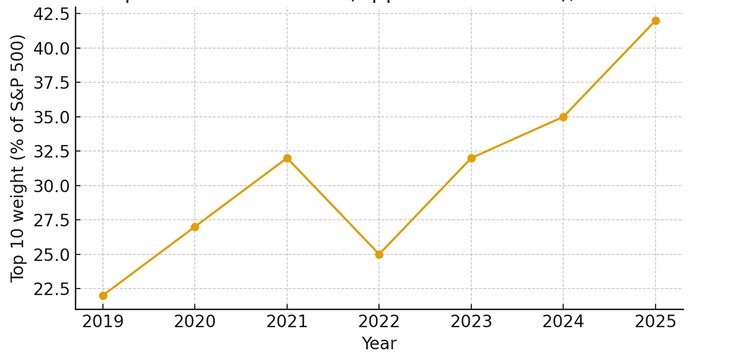 S&P 500 Top-10 Concentration (Approx % of Index), 2019-2025 YTD